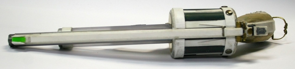 Next pic shows more progress and retro-futuristic design choices - ventilated rib on the top of the barrel, fluorescent plastic front sight, and a brass rear sigth, brass screws, basic hammer shape and a fancy trigger guard.